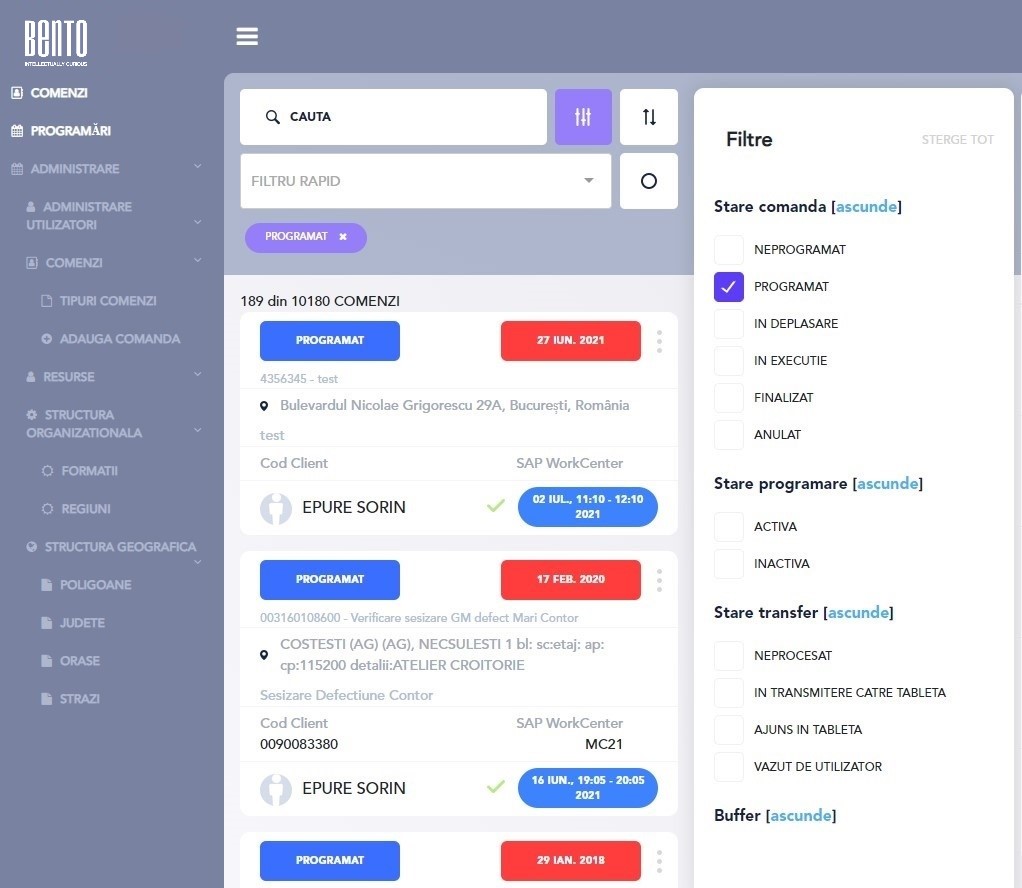 Funcționând ca sistem master sau integrat cu ERP-uri terțe, Bento Field Service Management este conceput pentru managementul eficient în timp real al echipelor de teren, planificare optimă a comenzilor de lucru, automatizare, alocare dinamică a comenzilor, optimizare generală, urmărire, raportare și managementul stocurilor.