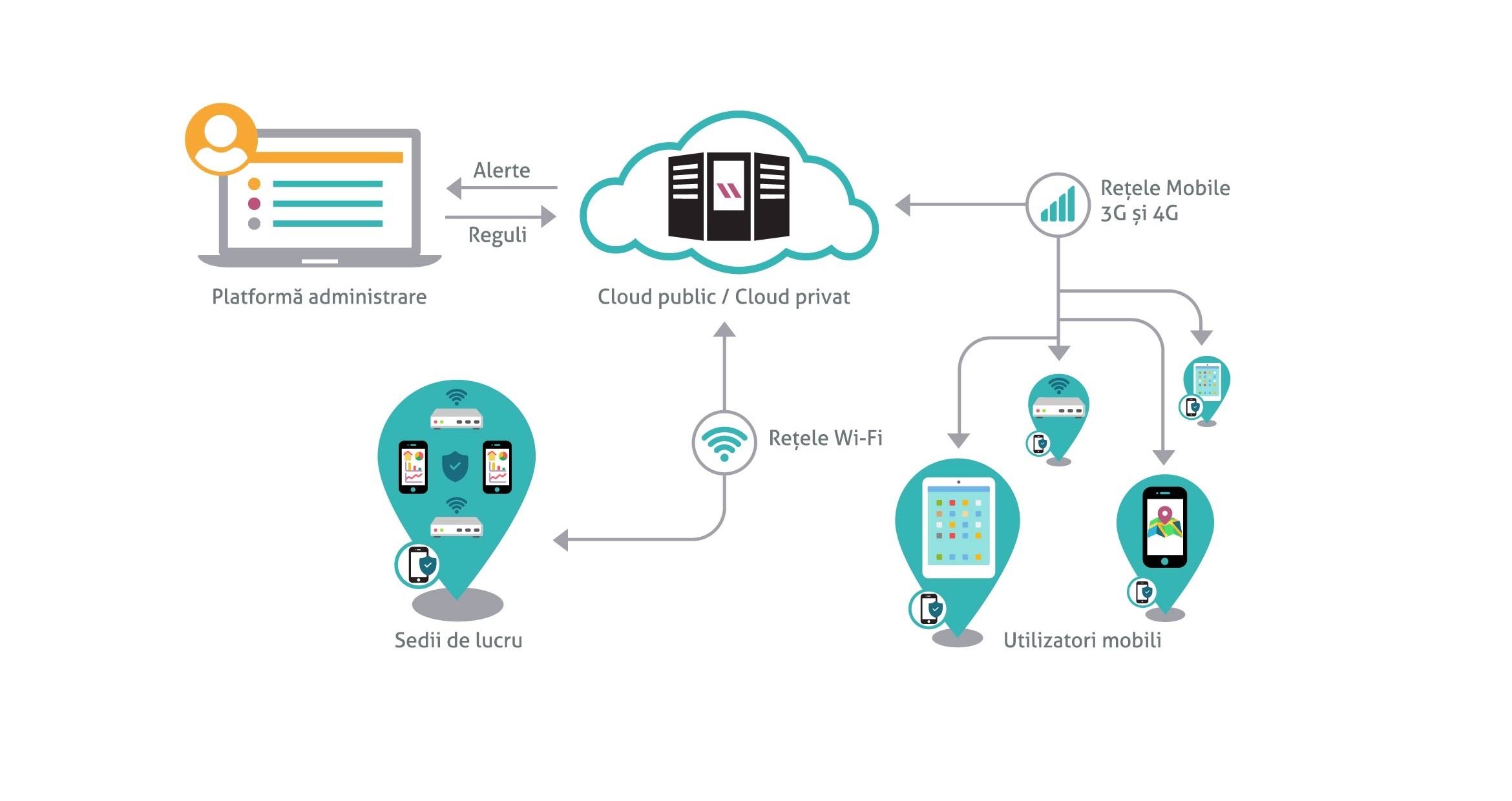 Platforma de management este utilizată de dispecerii, managerii IT, administratorii flotelor de dispozitive mobile și managerii de unități.